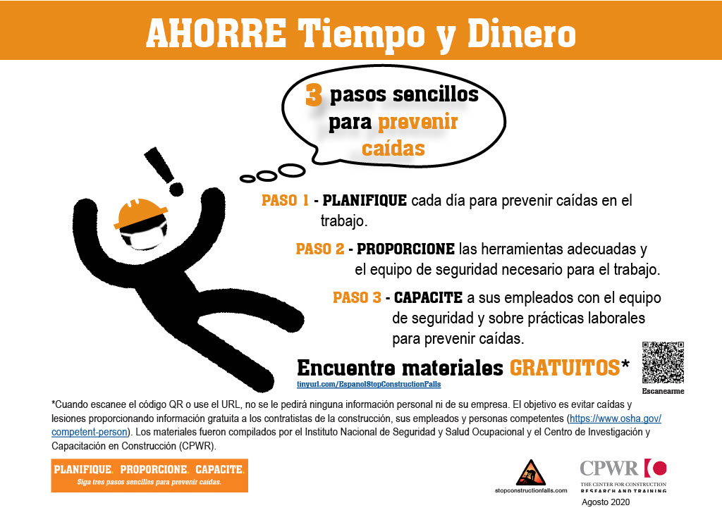 Spread the Word: CPWR’s Postcard, SAVE Time and Money (English & Español) can be used to encourage others to visit this website and plan/provide/train to prevent construction falls! Distribute the postcards to building permitting offices, local hardware stores, and other places small contractors frequent to provide others with access to information they may not be aware of that can help protect their employees.