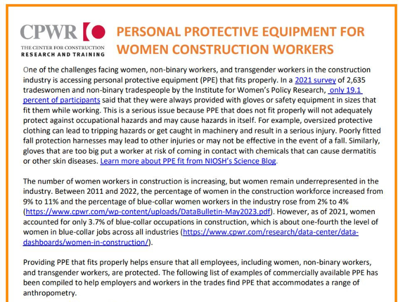 “Provide” Highlighted Resource: Personal Protective Equipment for Women Construction Workers (English). Find information about fall protection in extended, adjustable, and tailored sizes.